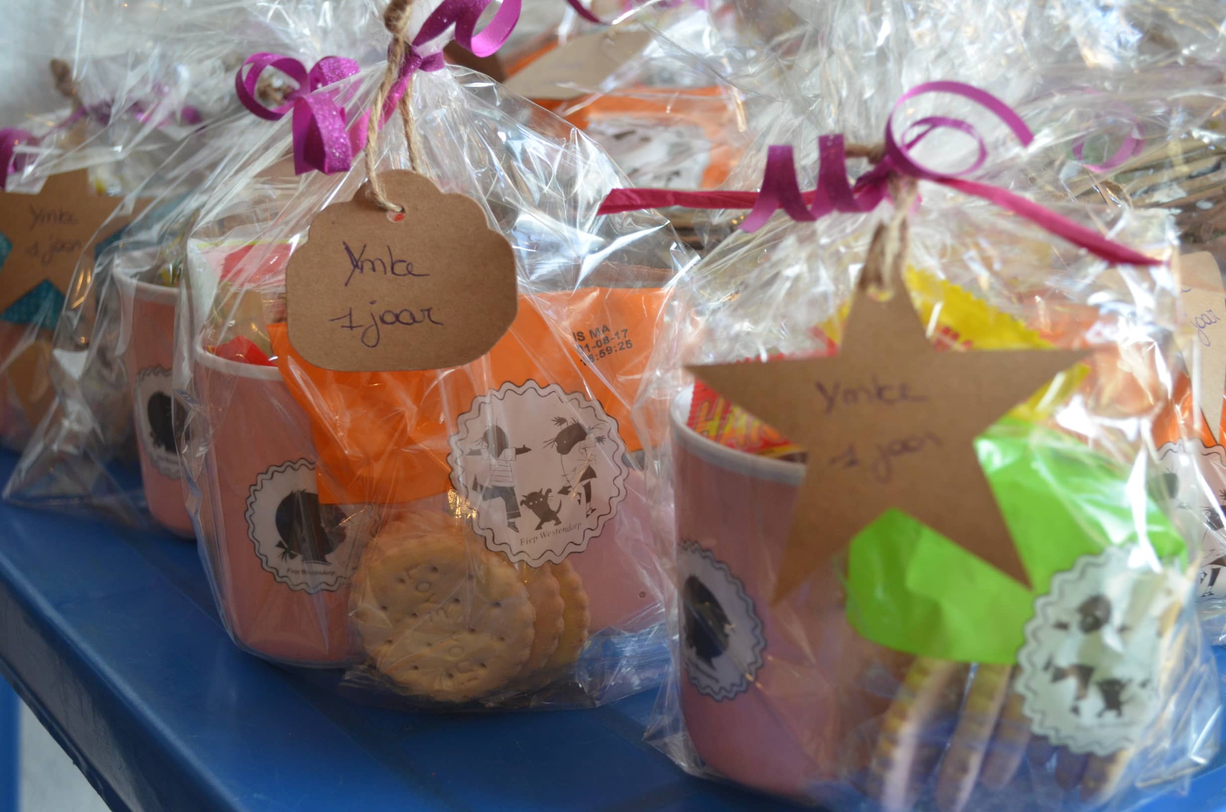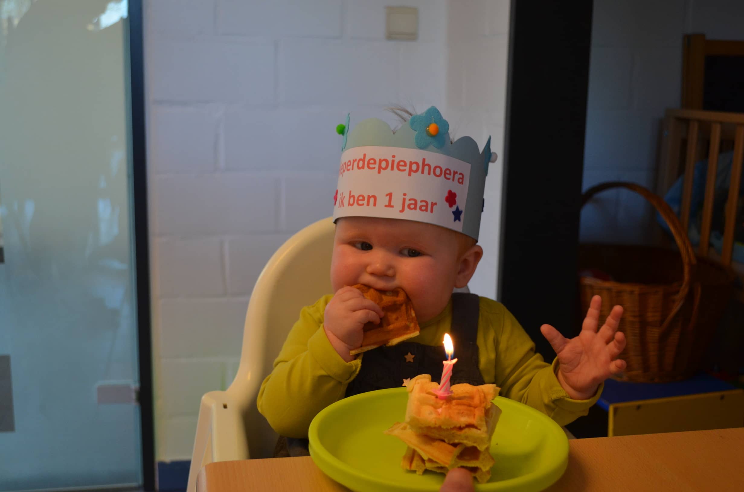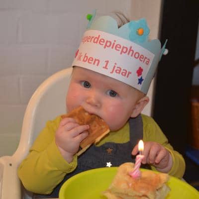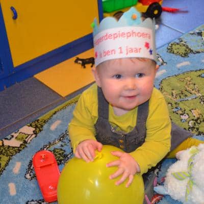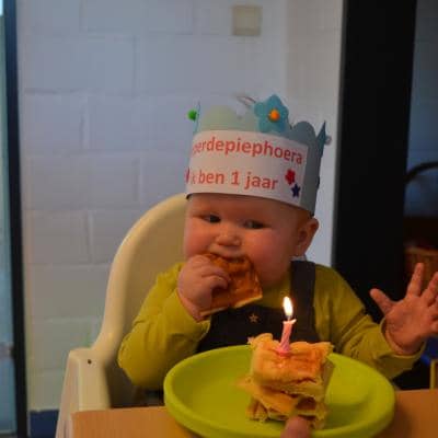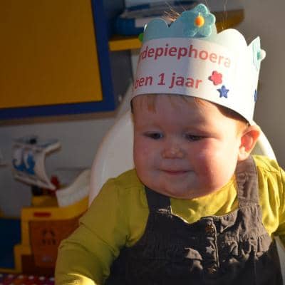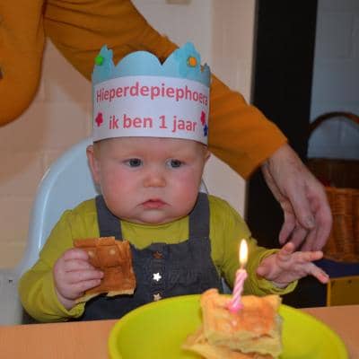 Op 1 december vierden we Ymke haar allereerste verjaardag. Ze kan voor haar leeftijd al aardige dansbewegingen: haar handjes draaien en haar heupjes zwieren al hevig heen en weer ( zou ze dat van haar zusje hebben geleerd?). Ze trakteerde haar snoezelvriendjes met een leuk gevulde drinkbeker van Jip & Janneke. Een blauwe beker voor onze snoezelboys en een roze voor onze snoezelgirls. Na het smullen van lekkere wafels en het zingen van onze mooiste verjaardagsliedjes gingen alle snoezelaartjes moe en voldaan naar huis. Behalve het enige echte feestvarkentje Ymke: haar lijfje zat nog vol feestadrenaline en ze was nog lang niet moe vertelde haar mama ons de volgende dag. Een feestbeestje in wording.