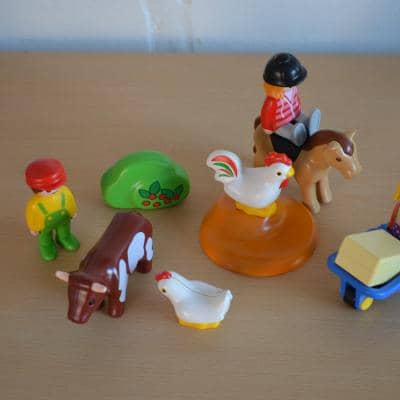 Onze boerderij werd uitgebreid met een paard, een ruiter, kippen, de boer en de boerin met de kruiwagen.