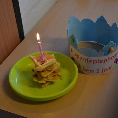 Op 1 december vierden we Ymke haar allereerste verjaardag. Ze kan voor haar leeftijd al aardige dansbewegingen: haar handjes draaien en haar heupjes zwieren al hevig heen en weer ( zou ze dat van haar zusje hebben geleerd?). Ze trakteerde haar snoezelvriendjes met een leuk gevulde drinkbeker van Jip & Janneke. Een blauwe beker voor onze snoezelboys en een roze voor onze snoezelgirls. Na het smullen van lekkere wafels en het zingen van onze mooiste verjaardagsliedjes gingen alle snoezelaartjes moe en voldaan naar huis. Behalve het enige echte feestvarkentje Ymke: haar lijfje zat nog vol feestadrenaline en ze was nog lang niet moe vertelde haar mama ons de volgende dag. Een feestbeestje in wording.
